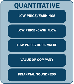 We determine this by looking for Low Price to Cash Flow, Low Price to Earnings, Low Price to Book Value, the Value of the Company, and Financial Soundness, all the key evaluation metrics that make up the quantitative side of our 10 Principles of Value Investing™. By measuring valuation and financial strength together, we establish a margin of safety.