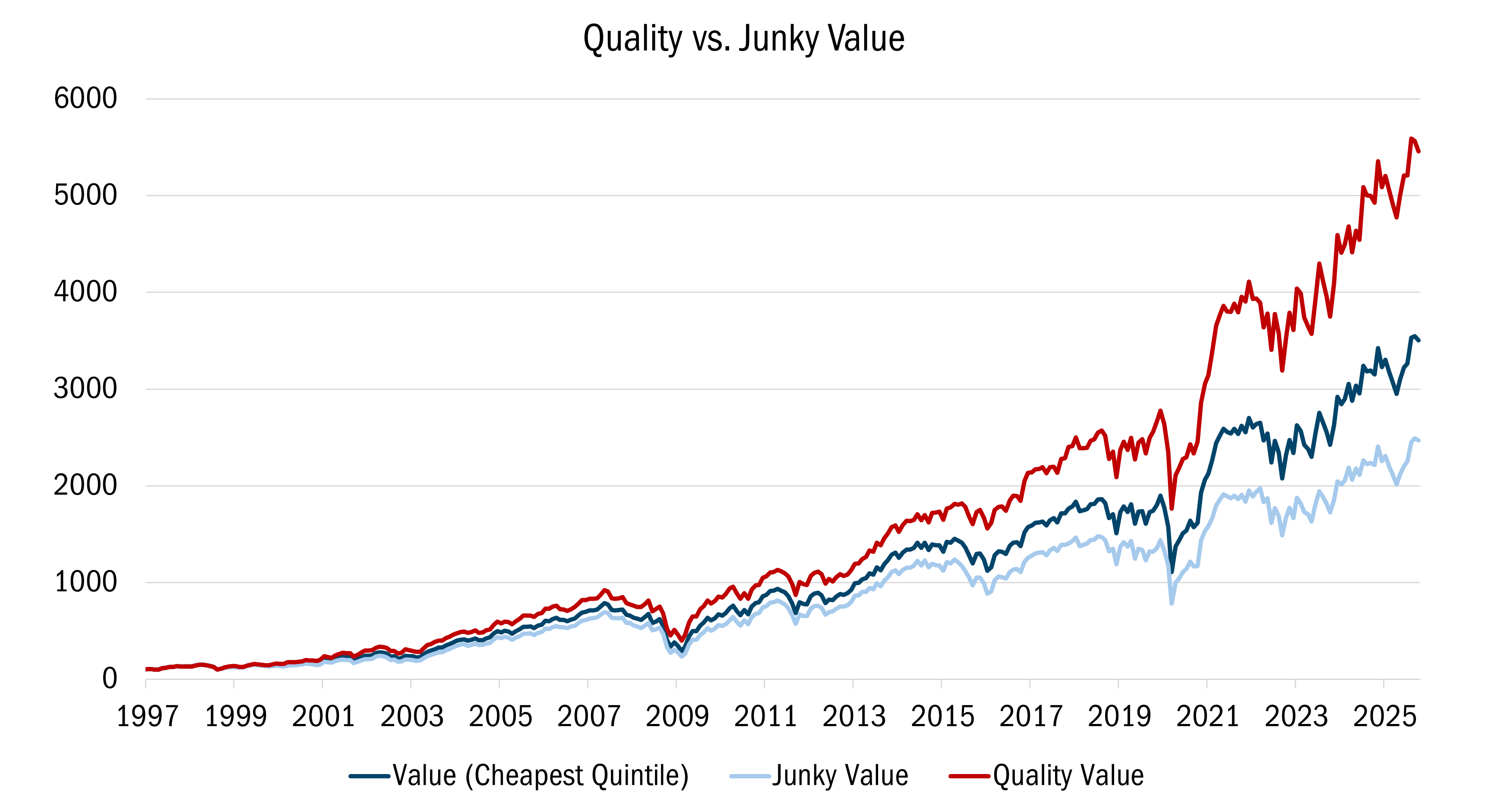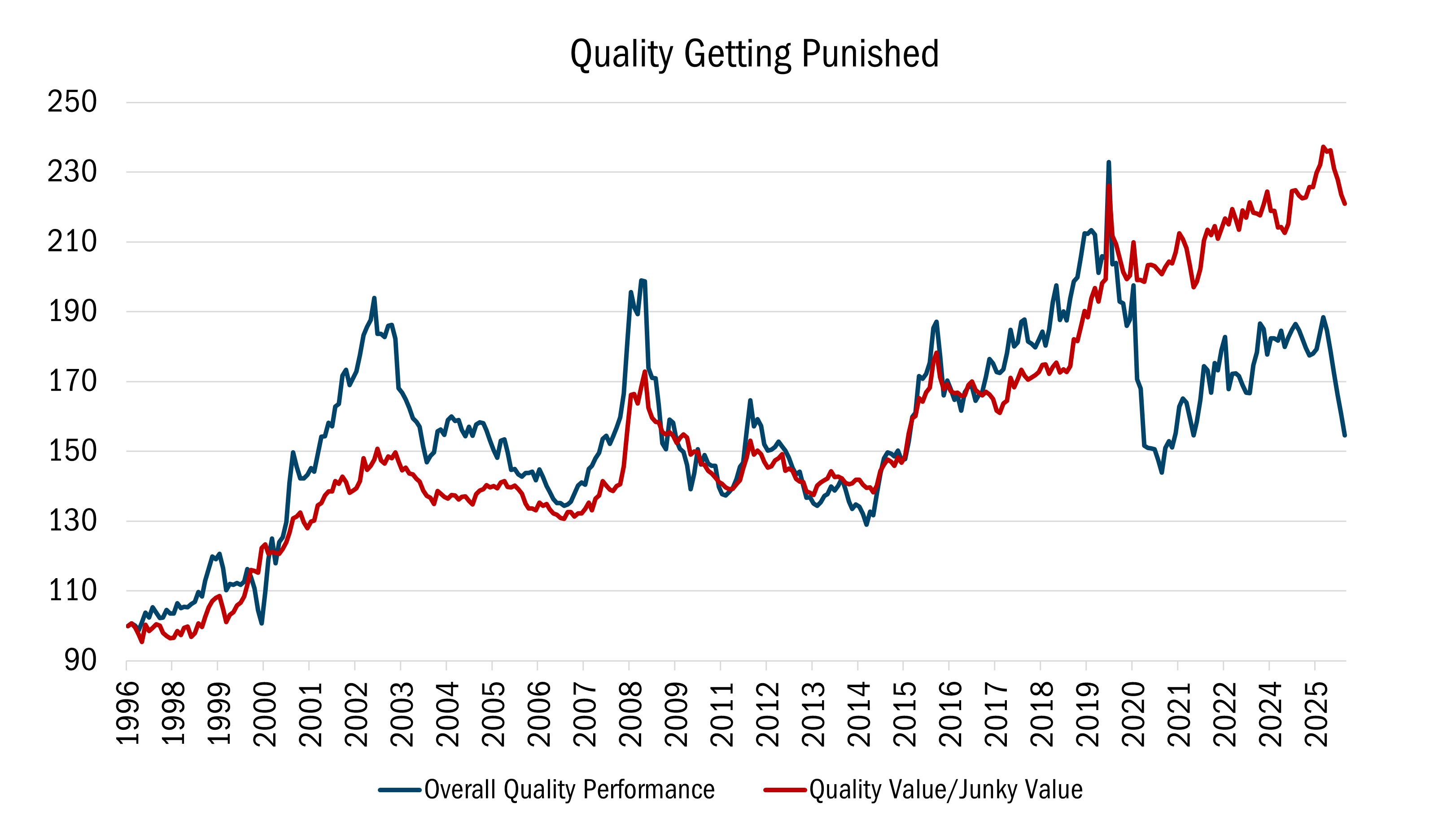 Source: The Leuthold Group. Monthly data from 12/31/1996 to 10/31/2025. The data in this chart shows the comparison of Quality Performance to Quality/Junky Value over time. All performance and return numbers are based on monthly rebalancing and members are equal-weighted. Value is a composite that consists of P/E, P/Sales, P/book and this factor is ranked across the largest 1500 stock universe and the cheapest quintile is considered Value. Quality is defined by 3 factors: ROE, Leverage (debt/assets) and operational (sales and earnings) stability. Then, ranked the largest 1500 US stocks by this composite 3-factor quality rank. The top quintile is high quality and bottom quintile low quality. Quality Value is defined as the cheapest stocks that are also in the top 2 quintiles of the quality rank. Junky Value is defined as the cheapest quintile stocks that are also in the bottom 3 quintiles of the quality rank. All indices are unmanaged. It is not possible to invest directly in an index. Past performance does not guarantee future results.