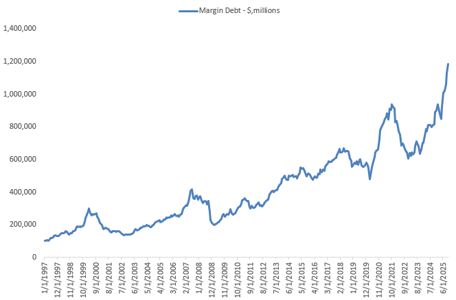 Source: FINRA. Data as of 9/30/2024 – 10/31/2025. The data in this chart shows the historical level of U.S. margin debt, illustrating how borrowing against investment portfolios has evolved over time. The data highlights long-term growth in margin debt with notable peaks during periods of heightened market activity. All indices are unmanaged. It is not possible to invest in an index. Past performance does not guarantee future results.