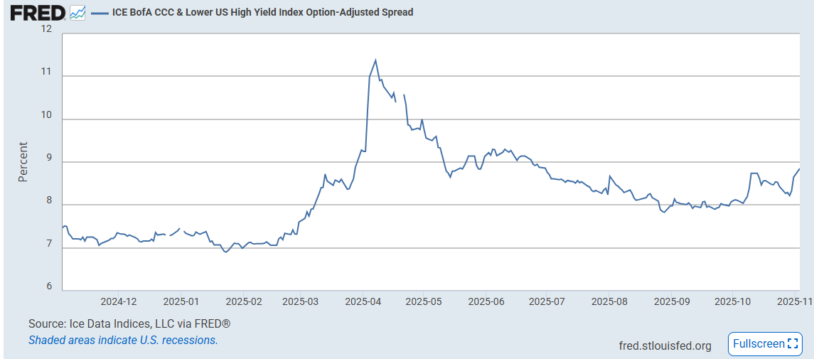 Source: Ice Data Indices, LLC via FRED. Monthly data 12/31/2024 to 11/20/2025. The data in this chart represents displays the ICE BofA CCC & Lower U.S. High Yield Index Option-Adjusted Spread, which measures the additional yield investors require to hold CCC-rated and below U.S. corporate bonds compared with U.S. Treasuries. All indices are unmanaged. It is not possible to invest in an index. Past performance does not guarantee future results.