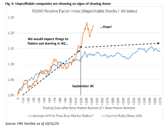 Source: Fuery Research Partners and FactSet. Daily data from 4/8/25 to 10/31/25 (for Current Rally)The data in this chart Compares the relative performance of Unprofitable Russell 2000 stocks in the bull market started on 4/8 to that of their performance at the start of prior bull markets. All indices are unmanaged. It is not possible to invest in an index. Past performance does not guarantee future results.