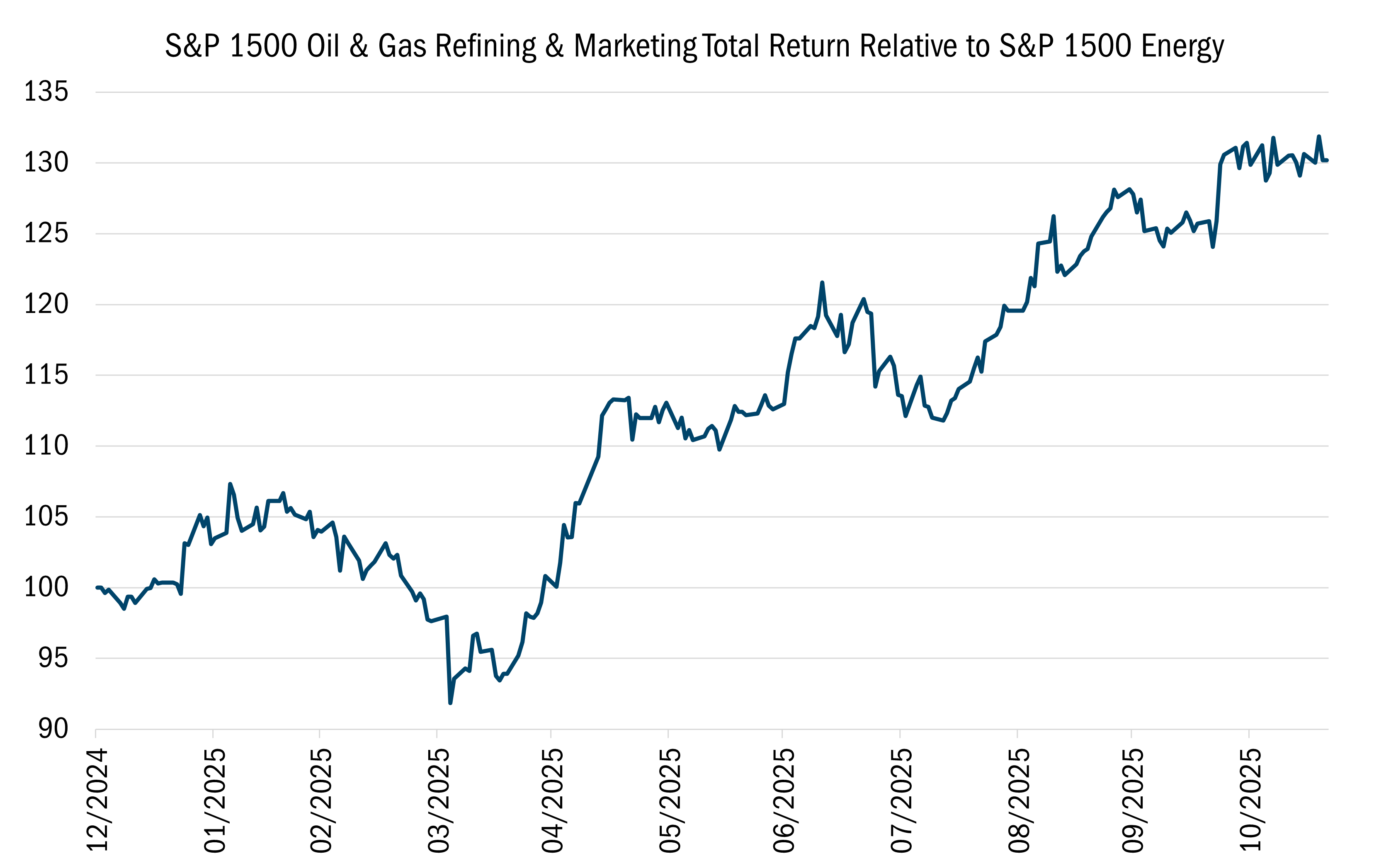 FactSet Research Systems Inc. Daily data 12/31/2004 to 11/20/2025. The data in this chart represents the S&P 1500 Oil & Gas Refining & Marketing Total Return Relative to S&P 1500 Energy. All indices are unmanaged. It is not possible to invest in an index. Past performance does not guarantee future results.