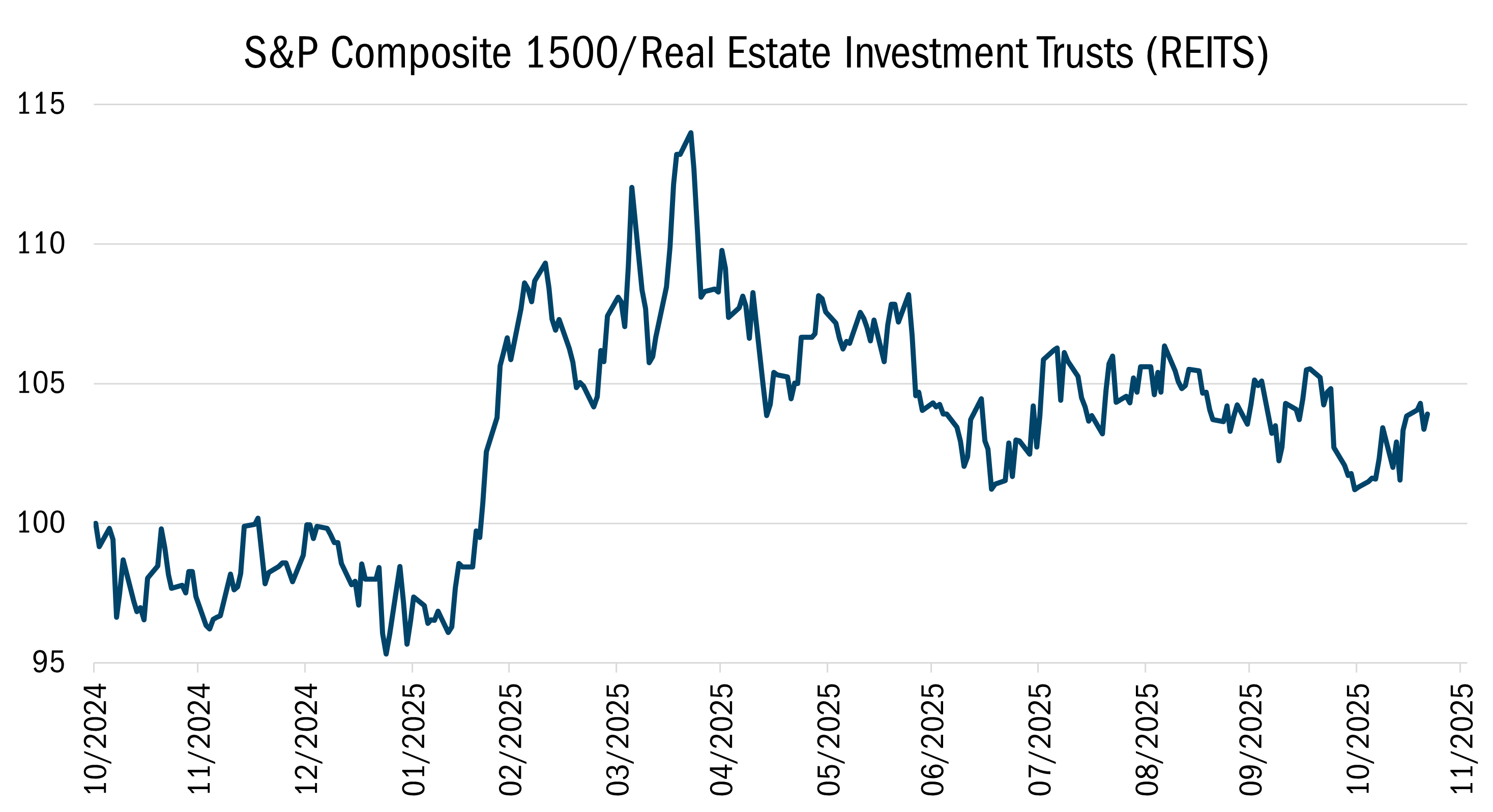Source: FactSet Research Systems Inc. Daily data 10/31/2024 to 11/20/2025. The data in this chart represents the S&P Composite 1500 compared to the Real Estate Investment Trusts. All indices are unmanaged. It is not possible to invest in an index. Past performance does not guarantee future results.