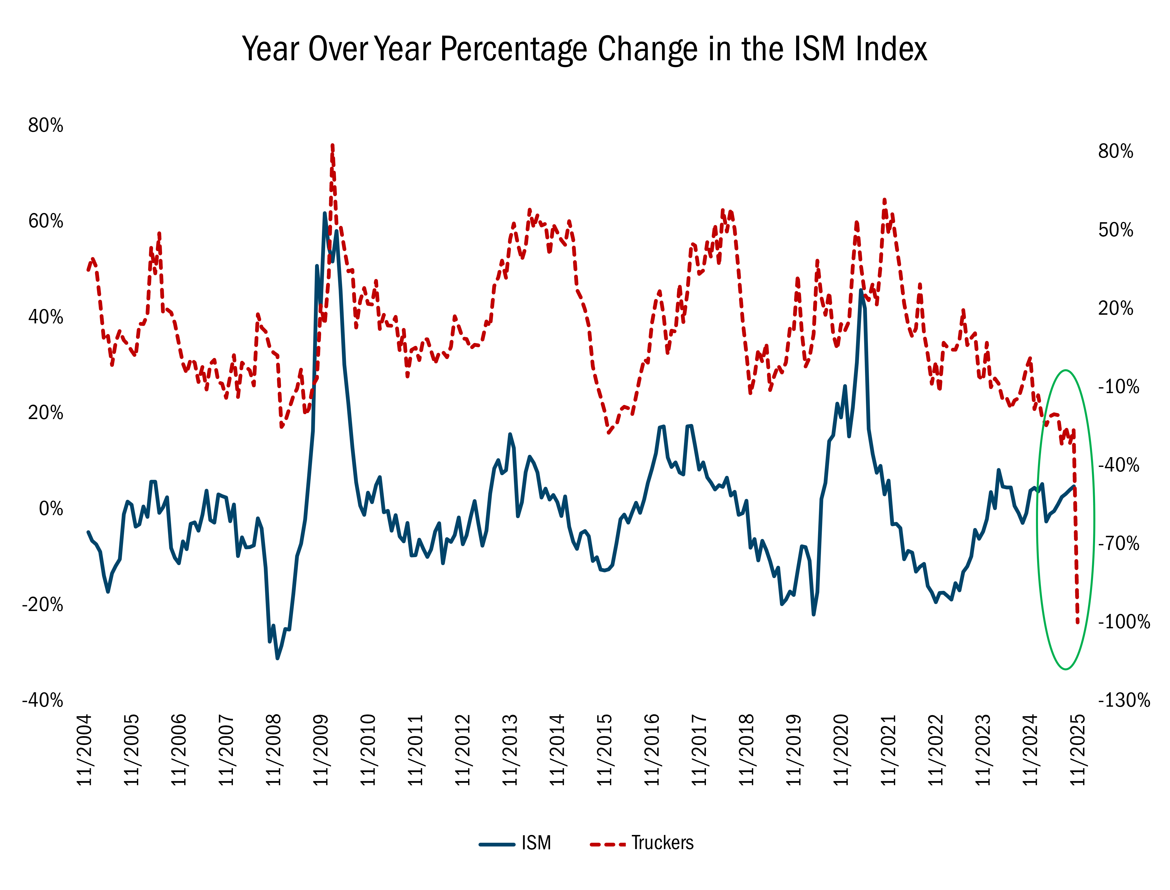 At the end of 2024, we also predicted that the trucking industry could be the canary in the coalmine for the economy. At the end of last year, there were many reasons to be hopeful for economic expansion, including anticipation of Federal Reserve interest rate cuts. That easing cycle, however, didn’t begin until September 2025 as inflation concerns lingered throughout the year. There were many other factors affecting the manufacturing sector, including uncertainties surrounding federal trade policy and tariffs. The result: The ISM Manufacturing PMI Index continued to weaken throughout the year, as did most trucking stocks.