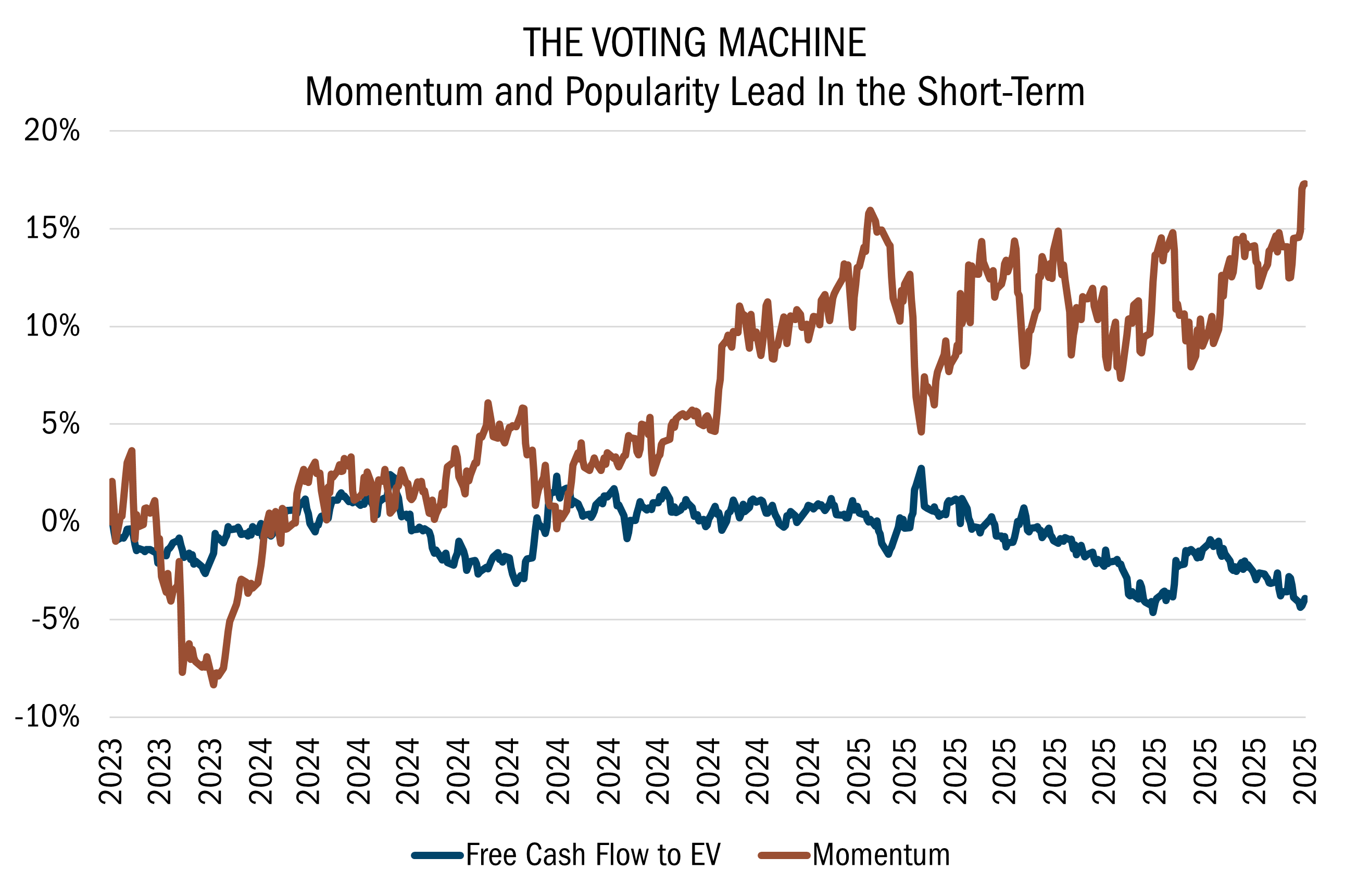 Benjamin Graham famously described this dynamic by saying that in the short run, the market is a voting machine, but in the long run, it is a weighing machine. In the voting phase, popularity matters. Investors “vote” with their dollars, rewarding what’s in favor and reinforcing momentum. This is how themes like AI and the so-called Magnificent Seven can dominate market leadership for extended periods.