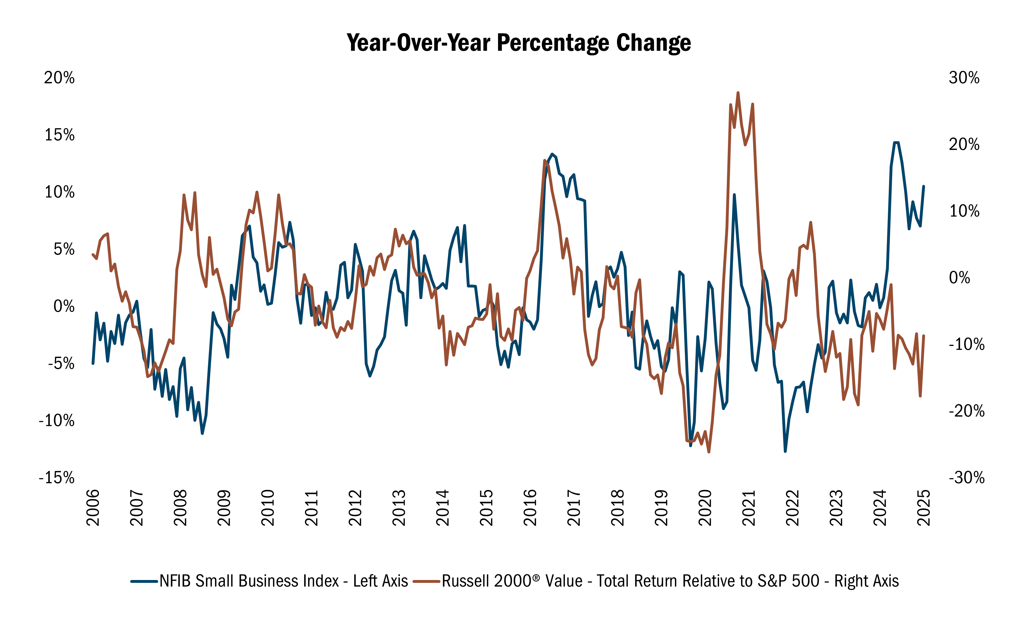 Source: FactSet Research Systems Inc. Monthly data from 8/31/2005 to 8/29/2025. The data in this chart represents a year-over-year percentage change in the NFIB Small Business Index compared to the Total Return of the Russell 2000® Value Index relative to the S&P 500 Index. Russell 2000® Value Index measures the performance of those Russell 2000® companies with lower price/book ratios and lower forecasted growth characteristics. NFIB Small Business Optimism Index is a small business optimism index compiled from a survey that is conducted each month by the National Federation of Independent Business (NFIB) of its members. The index is a composite of ten seasonally adjusted components based on questions on the following: plans to increase employment, plans to make capital outlays, plans to increase inventories, expect economy to improve, expect real sales higher, current inventory, current job opening, expected credit conditions, now a good time to expand, and earnings trend. S&P 500 Index is an index of 500 U.S. stocks chosen for market size, liquidity and industry group representation and is a widely used U.S. equity benchmark. All indices are unmanaged. It is not possible to invest directly in an index. Past performance does not guarantee future results.