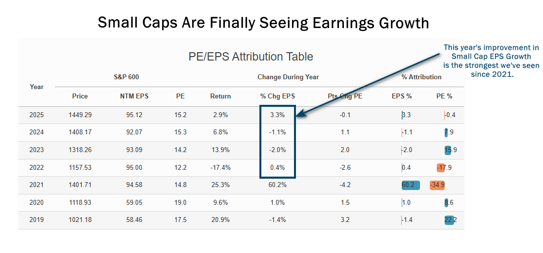 Source: Piper Sandler. Data from FactSet Research Systems Inc. and Compustat, yearly data from 1/1/2019 to 9/30/2025. This data shows the S&P 600’s price, NTM P/E, and NTM EPS estimate each year, measuring the change in both P/Es and EPS in a given year to arrive at that year’s price return. The S&P 600 is an index of small-cap stocks managed by Standard & Poor's. It tracks a broad range of small-sized companies that meet specific liquidity and stability requirements. This is determined by specific metrics such as public float, market capitalization, and financial viability, among other factors. All indices are unmanaged. It is not possible to invest directly in an index. Past performance does not guarantee future results.